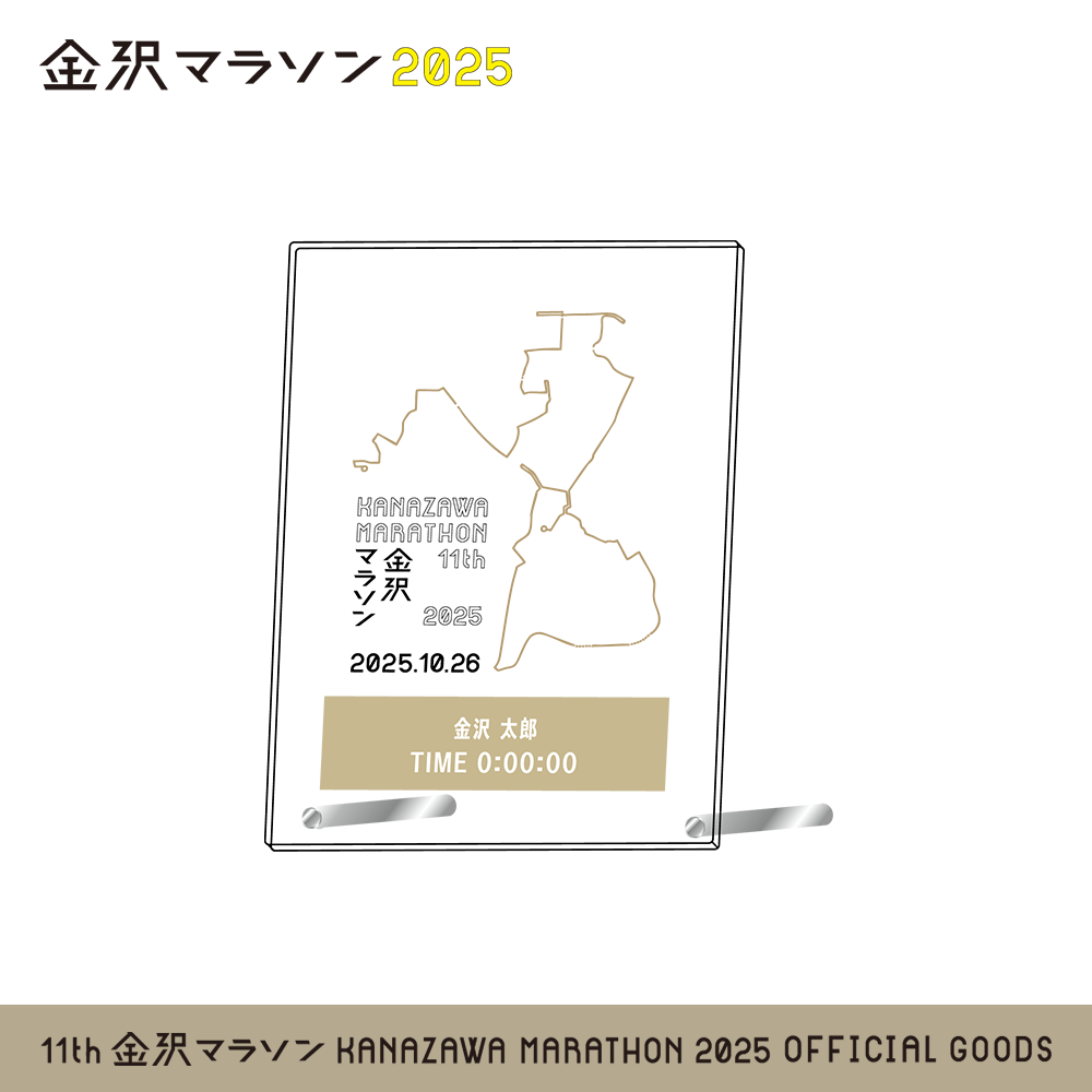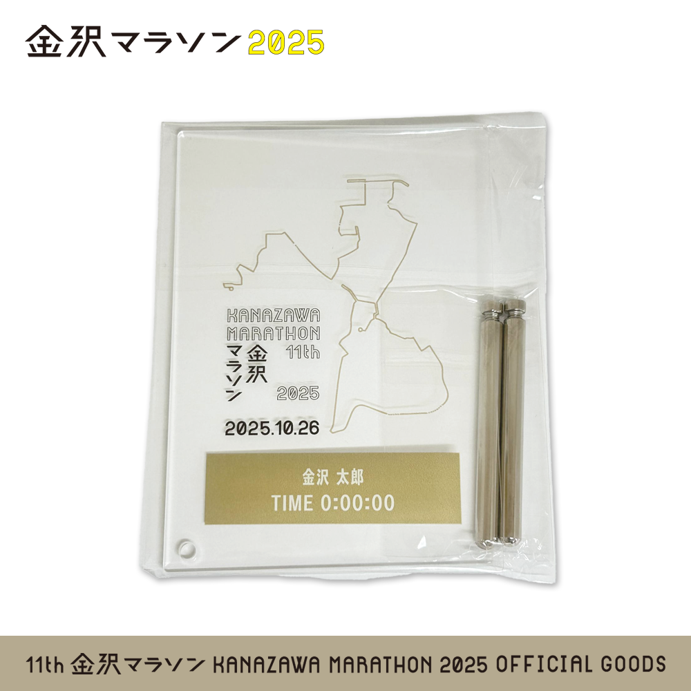 10月26日開催、「金沢マラソン2025」公式の記念アクリルプレート(盾)です。お名前と完走タイムを印字いたします。